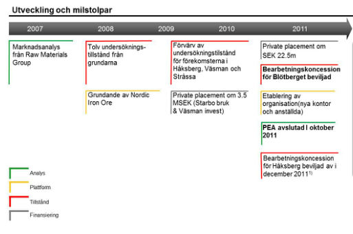 Nordic Iron Ore som startades så sent som 2008 som en sammanslagning av tolv undersökningstillstånd från Kopparberg Mineral, Archelon Mineral och IGE Nordic har på bara några år etablerat sig som en potentiell vinnare av de allt ökade intresset för järnmalm. Grundandet föregicks emellertid av en marknadsanalys från RMG, Raw Materials Group, vars tidigare VD Per Storm nu sitter i styrelsen för Nordic Iron Ore. Vi antar att detta kan indikera potentialen i projekten.