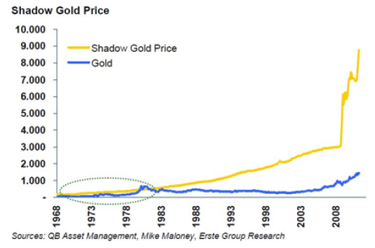 Faktum är att guldet är kraftigt undervärderat om vi beaktar den väsentliga obalansen i volym mellan dollarn och guldet vilket kan ses i bilden ovan. Den gula linjen representerar dollarmängden i samhället medan den blå symboliserar guldpriset. Det finns en anledning till varför den gula linjen betecknas som Shadow Gold Price ; det är där guldpriset egentligen bör vara. (Källa: QB Asset Management, Mike Maloney, Erste Group Research)
