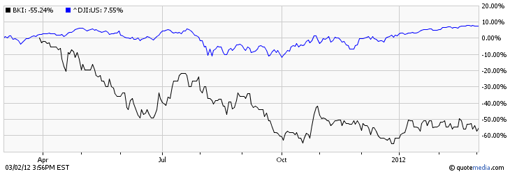 Den svarta kurvan representerar Black Irons aktiekurs, medan den blåa är Dow Jones. Precis som många andra råvarubolag, framförallt juniors, har Black Iron haft en besvärlig kursutveckling beroende på omvärldsfaktorer. Den som enbart stirrar sig blind på kursen tenderar emellertid att missa en stor del av de möjligheter som detta bolag står inför.