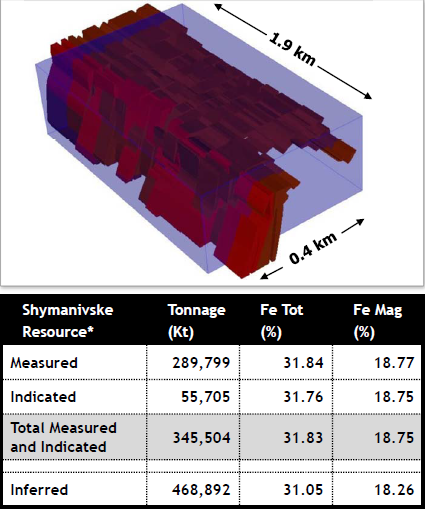 Shymanivskefyndigheten består av fyra järnrika skikt vars tjocklek sträcker sig mellan 40 till 80 meter. Resursen är definierad av mer än 37.000 meter historisk borrning.