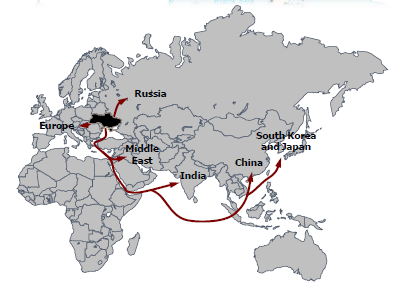 De järnrika områdena i Ukraina kan med enkelhet förse en rad olika marknader, som Västeuropa, Turkiet, Ryssland, Asien och Mellanöstern, med järnmalm eller produkter utvecklade därutav.