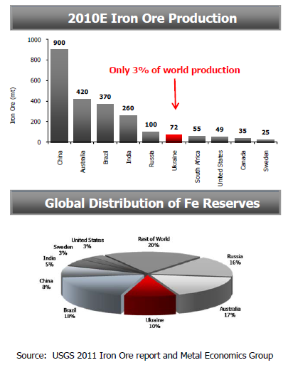 Ukraina svarar för endast tre procent av den globala produktionen av järnmalm, trots att landet förfogar över betydande mängder under den svarta jordens yta.