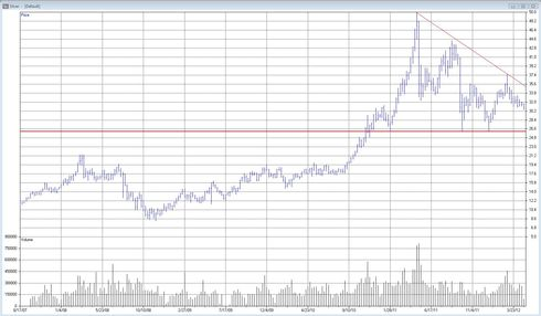 Vad är det då vi vill se för att gå in i silver igen? Ja, allt högre bottnar är förstås ett tacksamt tecken på att trenden slagit om till stigande igen. Men den fallande trendlinjen på veckobasis, som idag har värdet 35,40 USD/oz är också mycket viktig. När/om denna passeras, ser vi trenden som stigande i silver igen och kliver på tåget norrut.