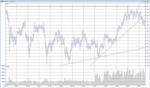 Hade uppgångsförsöket i början av april inneburit att motståndet, och tillika taket i konsolideringen, på 127 USD/fat hade passerats hade det varit ett mycket positivt tecken. Så skedde alltså inte. Istället fick vi en lägre toppnotering.