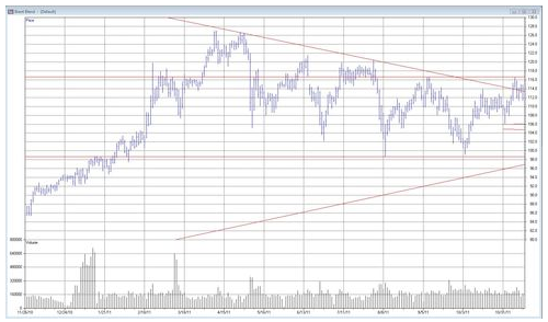 Idag är priset på Brent Blend på nästan samma nivå, men ändå har vi fått en intressant signal från oljan. Den 7 november lyckades nämligen oljan bryta den fallande trendlinje som varit gällande sedan toppen på 127 USD/fat den 11 april i år. Dagen efter, den 8 november, noterades oljan i 116,48 USD/fat som högst, innan den vände ned igen. Frågan som infinner sig är då givetvis, är det dags för långsiktiga uppgångar igen?