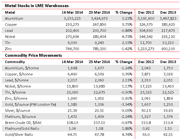 Fall in LME Metal Prices, December 2012-March 2014