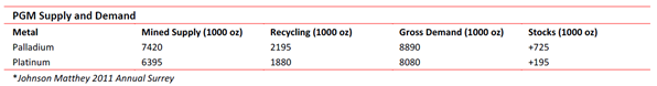 PGMs: No Such Thing as a Monopoly. If asked to pick a commodity firmly in the grip of its producers, most would go for platinum. South Africa mines 75% of it and Russia another 13%. But if you are thinking of switching to its cheaper (and less efficient) sister, palladium, those two countries account for 82% of that. So we should have a market grip even tighter than OPEC on oil, but we do not. Its price, whilst historically high, has followed the magnetic pull of gold, rather than its own price-demand profile. This is odd, since despite its precious qualities, it is an industrial metal and over a half is used in auto catalysts. This is where the fun starts. A PGM catalyst filters the exhaust fumes from an internal combustion engine and converts the noxious components into water vapour and nitrogen. Now they tell us the demand for oil burning vehicles is rising at 10% per year worldwide. With that industry taking 50% of all platinum (and 66% of palladium) that is a 5% per year increase in total demand. But it is not happening. Johnson Matthey says it will only be 3% in the automotive sector, so why? Well it is partly cost efficiencies, like using more palladium, partly smaller vehicles, the use of bio-fuels and rigorous recycling. But word has not penetrated into South Africa yet. They continue to crank the production handle with a forecast surplus of 195,000 oz this year. For palladium it will be more pronounced, at 725,000 oz or 8% of gross demand. A major feature is recycling, largely by the recovery of spent autocatalysts. It will provide 23% of new supply of platinum and 25% of palladium.
