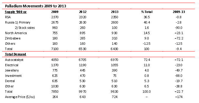 The ETF sector has been a success, largely thanks to the offtake in RSA of a record 765,000 oz. Palladium presents a marginally different picture. Primary supplies are forecast to decline a little to 6.43Moz in 2013 mainly due to a drop in sales from the Russian stockpile, much offset by recycling. The Chinese car market is set to boom, again being the major user of the metal in exhaust catalysts.