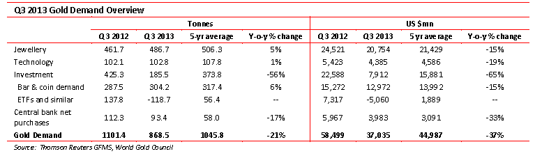 The gold bulls will not like this, but at $1282/oz at the close Friday 15th November, the price is down and showing no inclination to rise back above the $1300 threshold. This metal, which has few industrial outlets, relies on sentiment and fear, both of which channel it into investment mediums, usually short term. A growing one is the exchange traded fund (ETF). Now that authority, the World Gold Council or WGC, says in its Q3 2013 review that: