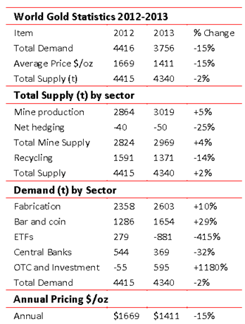 The World Gold Council Speaks. The WGC has delivered its definitive analysis on 2013, an indicative year for the metal. Now, whilst demand patterns matter, price rules. It fell heavily even as mined supply nudged up, real demand was down but over the counter transactions (OTC) burgeoned. Since year end we have seen a significant price bounce (like 10% in less than 8 weeks), so where to now? Major events were: