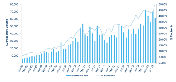 Den ökade elektroniska handeln i WTI-kontrakt kan hänföras till ett par faktorer. Flera av de affärer som tidigare genomfördes på börsernas handelsgolv har nu flyttat till skärmarna. En av anledningarna till detta är den ökade aktiviteten i Request for Quotes (RFQ), den mekanism som gör att marknadsaktörerna kan utföra avslut i spreadar på Globex, CME Groups elektroniska handelsplattform. RFQ står nu för 13 procent av optionsavsluten i WTI på Globex.