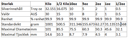 Till och med 1999 framställdes Lunar-mynten i fyra storlekar: 1/20 oz, 1/10 oz, ¼ oz och 1 oz. Från och med 2000 tillkom följande storlekar: 2 oz, 10 oz och 1 kg och 2004 började perth Mint även att producera mynt med en vikt om ½ troy ounce.