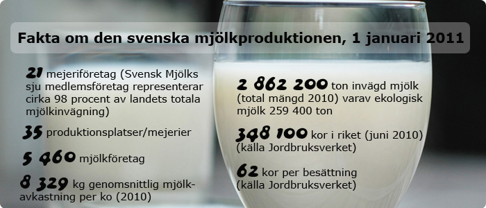 2010, vilket är det senaste året som Svensk Mjölk redovisar uppgifter för, uppgick den totala mängden invägd mjölk till 2.862.200 ton, varav den ekologiska svarade för 259.400 ton, motsvarande nio procent av all mjölkproduktion i Sverige.