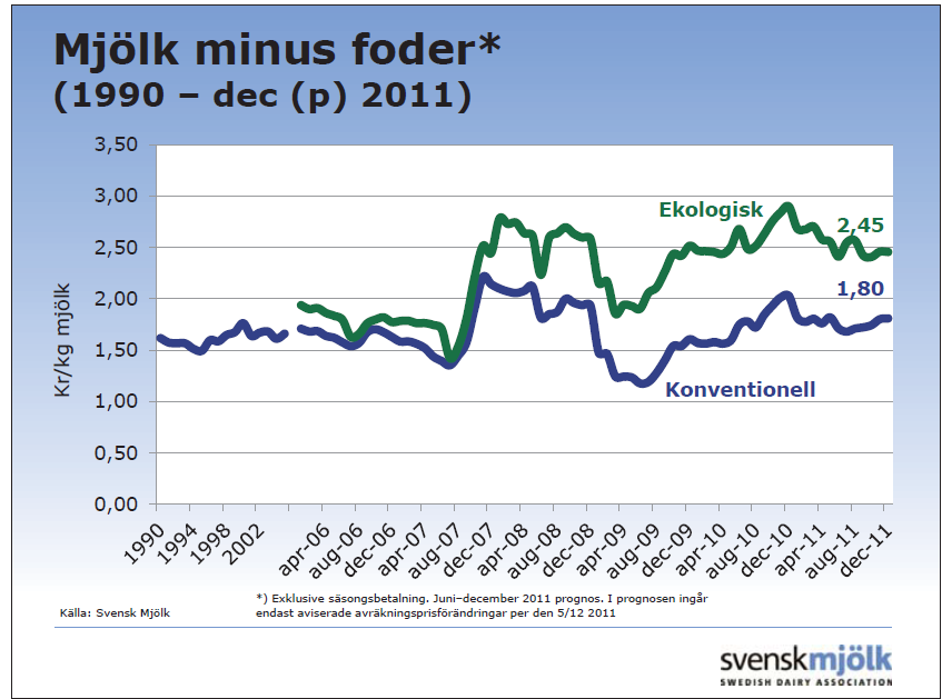 Utvecklingen av nyckeltalet mjölkintäkt minus foderkostnad för en konventionell respektive en ekologisk typgård uttryckt i nominella belopp (kr/kg mjölk). Nyckeltalet är beräknat på avräkningspriser exklusive säsongsavdrag/- tillägg och efterlikvider. Juni – december 2011 är prognos där det endast ingår aviserade avräkningsprisförändringar före den 5/12 2011. Källa: Svensk Mjölk.