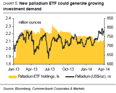 In our opinion, risks to supply in conjunction with robust demand point to higher platinum and palladium prices. According to data from Johnson Matthey, the supply-demand situation was already tight on both markets last year, the global platinum market showing a supply deficit of 605,000 ounces in 2013 and demand outstripping supply on the global palladium market by 740,000 ounces. Assuming the supply problems are not resolved in the near future and demand remains robust, the situation on both markets will doubtless tighten further. By year’s end we continue to envisage a platinum price of $1,600 per troy ounce, while palladium is likely to be trading at $825 per troy ounce.