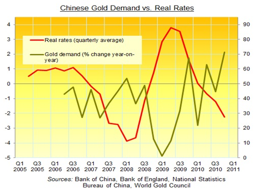 Sedan dessa förutsägelser – som alla lämnades av stora globala banker – har den kinesiska centralbanken fortsatt att höja räntorna, samtidigt som kinesernas efterfrågan på guld, mätt i yuan, har fortsatt upp – tillsammans med priset på guld. Därmed inte sagt att räntan inte har någon påverkan på efterfrågan på guld alls, ser vi närmare bakom dessa siffror går det att konstatera att realräntorna, skillnaden mellan den nominella räntan och inflationen, har ett samband med minskade köp av guld.