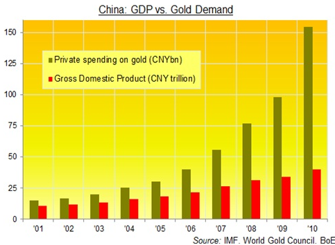 Sedan 2004 har Kinas ekonomi dubblats, men de kinesiska guldköpen har under samma period ökat med mer än 500 procent. Det finns inget som tyder på att det kommer att stoppa här, snarast är det så att Kina arbetar på att komma i kapp. Landet avreglerade sin guldmarknad så sent som 2001, att jämföra med Indien som gjorde samma sak 1990. Indien som är det enda land som köper mer guld än Kina, spenderade 2,5 procent av sin BNP på guldinköp 2010, samma siffra för Kina var 0,4 procent. Hade den kinesiska konsumtionen legat på samma nivå som den indiska hade Kina köpt 3.000 ton guld under förra året – 78 procent av den globala konsumtionen. Det hade fått guldpriset att stiga till rekordnivåer. 0,4 procent är en låg siffra, men den stiger hela tiden – och det gör även landets BNP vilket gör att det är betydligt mer guld som köps av kineserna varje år som går. 2009 användes 0,3 procent av den kinesiska BNP:n till att köpa guld, och året innan var samma siffra 0,25 procent. När Kina växer köps mer guld.