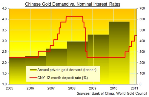 Ta till exempel Kina, ett land som är ett utmärkt exempel på att stigande räntor mycket väl kan öka efterfrågan på guld eftersom inflation och tillväxt är två betydligt viktigare värdedrivare. Nu är Kina kanske inte ett typiskt exempel, men det är onekligen värt att titta närmare på då landet är världens näst största nettoköpare av guld, endast passerat av Indien. Data från World Gold Council visar att Kina under det första kvartalet 2011 stod för en tredjedel av världens globala guldkonsumtion mätt i ton. Jämfört med samma period 2010 steg köpen av guld med 47 procent och detta trots att den kinesiska centralbanken höjt räntan inte mindre än fyra gånger. Grafen nedan visar på att de kinesiska guldkonsumenterna under de senaste fem åren ignorerat centralbankens räntehöjningar.