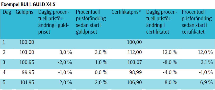 Bull & Bear-certifikaten ger en viss hävstång på den dagliga prisförändringen i referenstillgången. Mätt över en längre tidsperiod än en dag kan den totala värdeutvecklingen i certifikaten bli såväl större som mindre än vad hävstången anger. Detta illustreras i nedanstående räkneexempel för ett Bull-certifikat med en daglig hävstång på fyra (x4) kopplat till guldpriset, där guldpriset stiger med totalt 2,0 % under perioden.