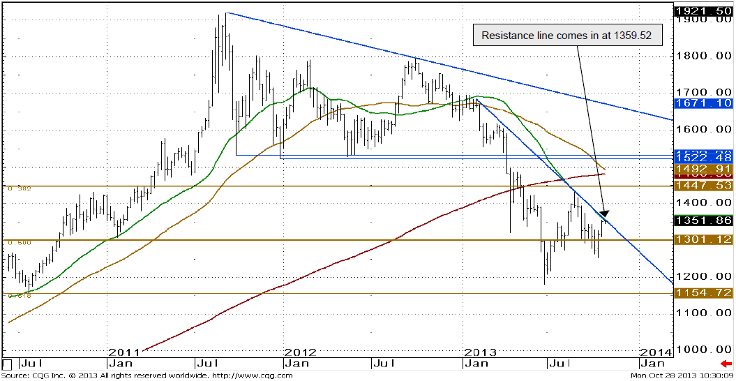 - For our short- and medium term outlook to once again become bullish we would like to see at least two daily closes above the 2013 resistance line at 1360 being made this week.