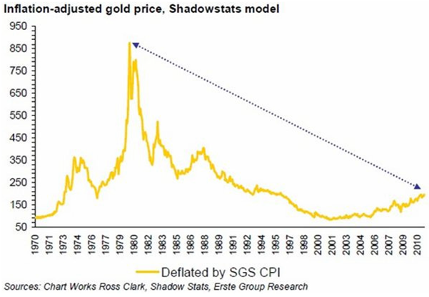 Another argument against gold as an investment is that gold is not really the best store of value as it is so branded often. True, but only if you just look at some figures without putting them in their real perspective. The former nominal high of all times was $850 dating from January 1980 was first seen again 28 years later, to be precise in January 2008. The picture looks already much better if you consider that the $850 high was mainly reached in all of the two preceding weeks since it had started 1980 at $550. As nobody mentions that $550 anymore, let’s indeed take the $850 as the former historical milestone. Then we would contently analyze that gold has more than doubled since 1980. True again, but not really. What has really happened to gold if we take into consideration what the loss of buying power, or call it inflation, has done to our money. The interesting chart below shows us how the real value of gold has developed since the $850 of 1980. Quite a different picture. This picture clearly contradicts what so many people think and say, that gold is too expensive at current prices. As I have elaborated on this in earlier reports, gold is not high from an historical point of view.