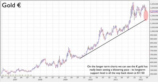 Samma femårsgraf uppräknat i euro och här ser marginalerna helt annorlunda ut gentemot dollarn. Notera höjdskillnaden mellan aktuella kursvärden och den nedre stödlinjen. Detta visar att även om kursutvecklingen inte tar fart behöver det inte betyda att trenden är bruten. (Källa: Gold Made Simple News)
