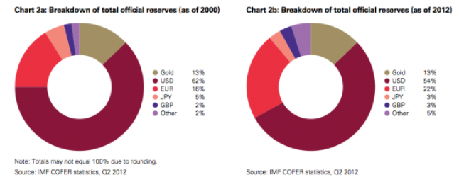 Graferna ovan visar procentandelarna av centralbankernas valutareserver; i förhållande till föregående graf där guldet har ökat i rent tonnage har procentandelen förblivit densamma. (Källa: World Gold Council – Central Bank Diversification Strategies)