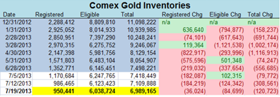 I rapporteringen för den vecka som slutade den 19 juli kan vi utläsa att guldlagren minskade med 120.723 troy ounce, guld som alltså lämnat COMEX lager. Detta gör att lagernivån noterar ett nytt årslägsta och ligger i samma nivå som det befanns sig på i början av 2006. Vad gäller kategorin Registered så befinner sig lagernivån på de lägsta nivåerna sedan COMEX började publicera uppgifterna 2002.
