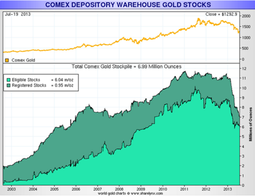 Som vi kan se i tabellen ovan så har guldlagren konsekvent minskat hos COMEX under det senaste halvåret, det skedde alltså redan innan vi såg hur guldpriset föll i april 2013.