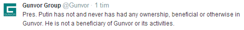 Gunvor Group svarar på Twitter att president Putin inte har, och aldrig har haft, något ägande i Gunvor Group, eller någon annan form av ekonomiska kopplingar.