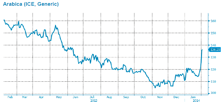 Strax innan jul släppte vi vårt mycket framgångsrika trading case på kaffe, där vi fann stöd i bl.a. minskade lager av både Arabica – och Robustakaffe, men också i sämre kvalité på 2013 års skörd som följd av sämre väderförhållanden. Vad som mer talade för en prisuppgång var de stigande fasta kostnaderna som varit en klar utmaning för kaffeodlarna. De senaste årens fallande kaffepriser har i kombination med stigande produktionskostnader gjort kaffeodling till en olönsam affär för många kaffeproducenter.