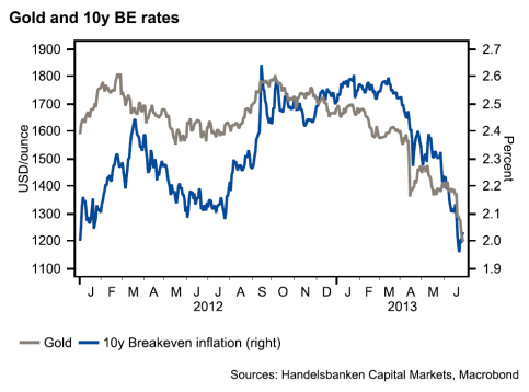 - Marknadens inflationsförväntningar för de närmaste 10 åren har stigit de senaste dagarna. De har fallit under våren och haft bra signalvärde för guldet (se graf).