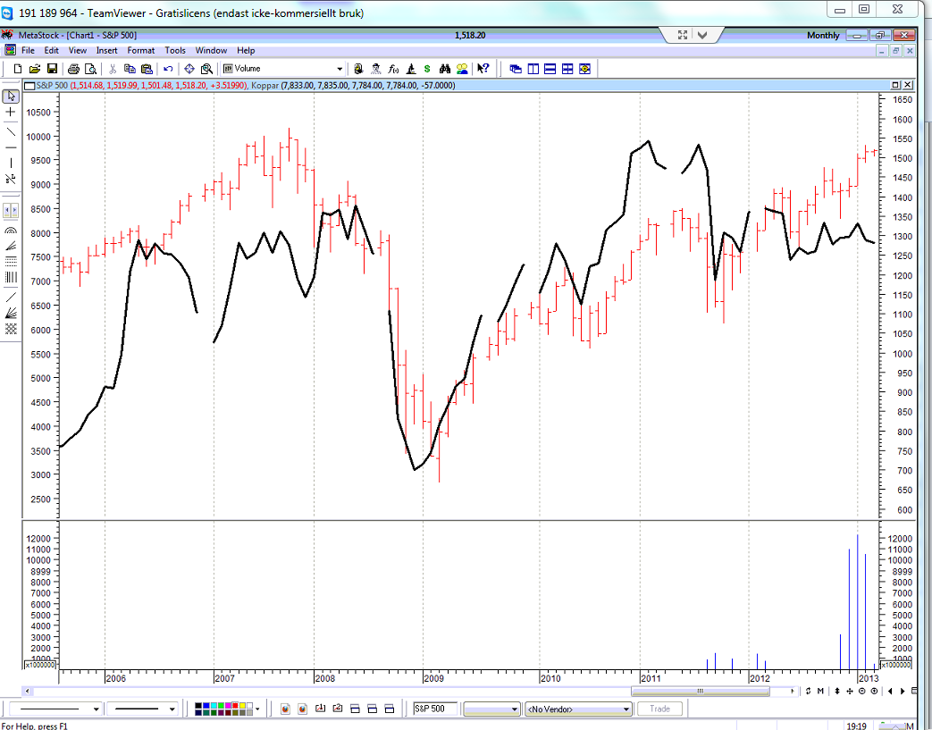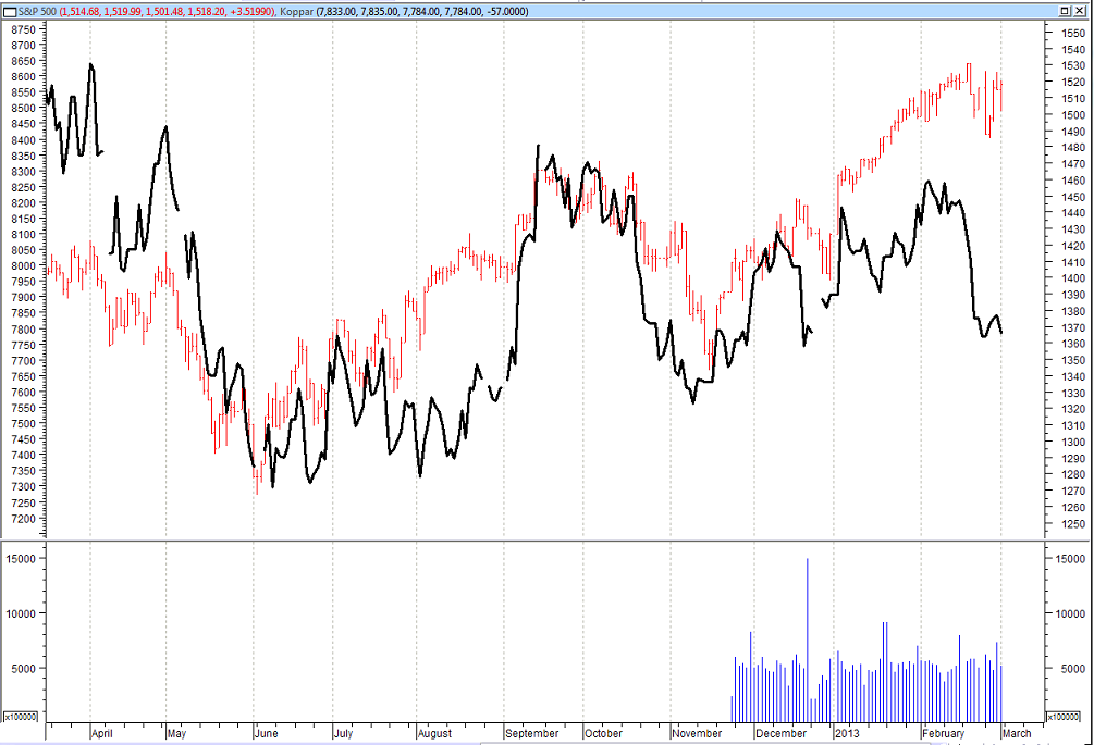 Diagrammet ovanför visar hur kopparpriset (den svarta kurvan) rört sig i förhållande till S&P500 (den röda kurvan) under det senaste året. Nedan ser vi samma relation sedan mars 2005.