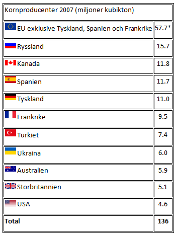 I 2007 års rankning av spannmål i världen, var korn det fjärde vanligaste sädesslaget både vad gäller producerad kvantitet (136 miljoner ton) och i odlingsareal (566.000 km²).