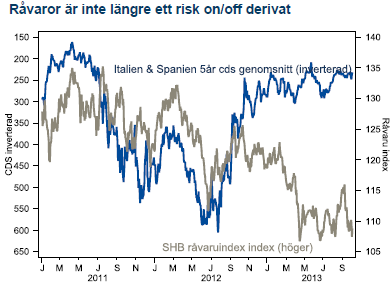 Dämpad global tillväxt och stark tillväxt i utbudet av många råvaror har gjort att prisutvecklingen har varit modest under 2013. Råvaror handlas inte längre som ett risk on/off derivat som under 2011 och 2012 vilket gjort råvaror mindre beroende av makro och mer prissatta utefter varje råvaras fundamenta. Följaktligen har korrelationen mellan aktier och råvaror fallit samtidigt som korrelationen mellan enskilda råvaror också trendat nedåt.