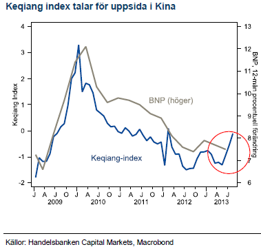 Vi tror att Kina håller på att stå för andra halvårets positiva makroöverraskning. Efter inbromsning och ”svagare än väntat data” under 2012 och H1 13 så pekar nu barometerdata på en vändning i Kina. ”Keqiang index” som består av järnvägstransporter, elproduktion och utlåning talar för att BNP för Q3 kommer överraska på uppsidan. Flera indikatorer talar för en starkare utveckling i början av hösten trots att PMI serierna inte har förutspått denna uppgång i industriaktiviteten. Ökad kreditgivning och till viss del stimulansinvesteringar från de nytillträdda ledarna har vänt vårens kraftiga inbromsning i den kinesiska industrin. Att PMI-serierna inte har pekat uppåt tidigare förklarar vi med den djupt rotade pessimism som spridit sig i industrin efter 2012 års kreditåtstramning och bestående överkapacitet.