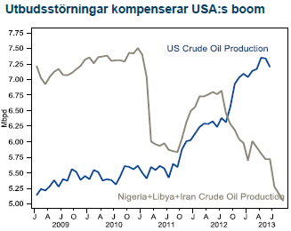 När mycket av riskpremien nu är borta kan man återigen förvänta sig stigande oljepris på mer fundamental grund. Produktionsstörningar på flera håll, och av skilda orsaker, kompenserar för den nytillkomna oljeproduktionen i USA. Nigeria, Libyen och Iran ser alla ut att vara långvariga störningar medan Irak kan bli en sådan. Samtidigt gör den globala konjunkturförbättringen sitt för att stärka efterfrågan.