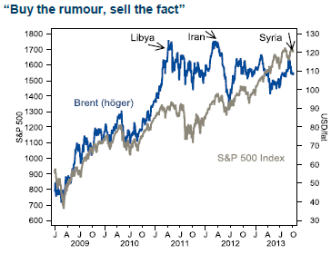 Obamas retorik kring inbördeskriget i Syrien drev snabbt upp oljepriset från 100-strecket. Syrien är inget oljeland men den pågående konflikten i Syrien mellan Shia och Sunni har en direkt återspegling i Irak som åter blivit ett viktigt oljeland. Iraks återkomst till exportmarknaden har skett simultant med att Iran föll bort efter sanktionerna förra året. Irak lindrade därmed konsekvenserna av sanktionerna och Irak är viktigt i dagsläget då dess export inte kan kompenseras av Saudis återstående reservkapacitet.