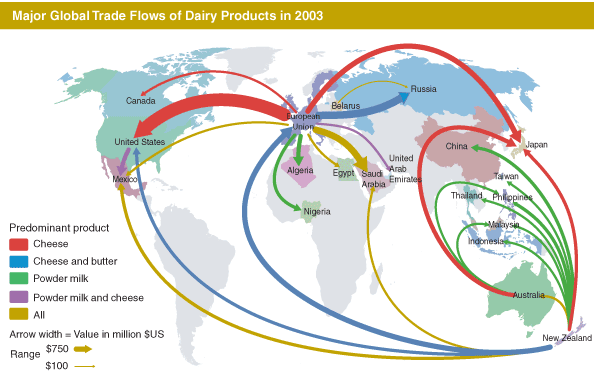 En växande exportmarknad kan motverka effekten av fallande priser på mejeriprodukter på den amerikanska marknaden. Den kinesiska mejeriproduktionen växer årligen med cirka 15 procent, och många andra utvecklingsländer når tillväxttal om tio procent per år, siffror som skall ställas mot västvärldens årliga ökningar om 0,4 procent.