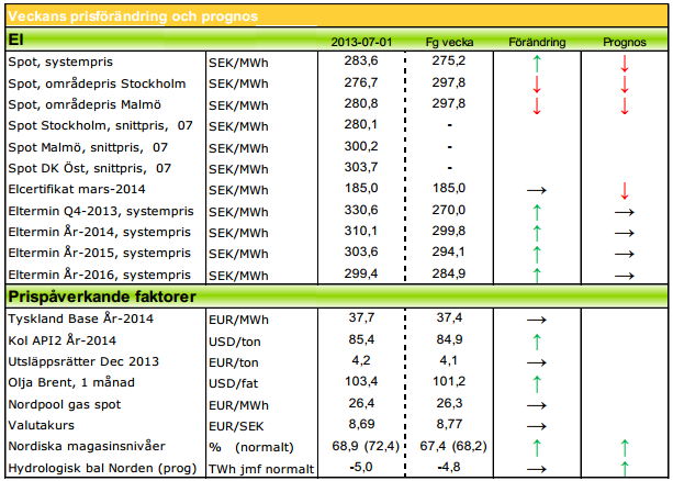 Terminerna återhämtar sig lite på torrare prognoser. Utsläppsrätterna sidledes i avvaktande marknad. Spoten har kommit ned på vardagar, riktmärke 30 €/MWh. Kärnkraften i Sverige är idag på 87 %. Certifikat handlas knappt – sommarstiltje.