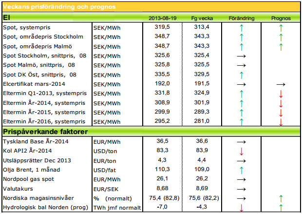 Efter några torra prognoser och uppgång i marknaden, har nu blötare väder förutspåtts och marknaden faller tillbaka en aning. Stiltje på utsläppsrätterna innan tyska valet. Elcerten sakta på väg upp liksom hydrobalansen.