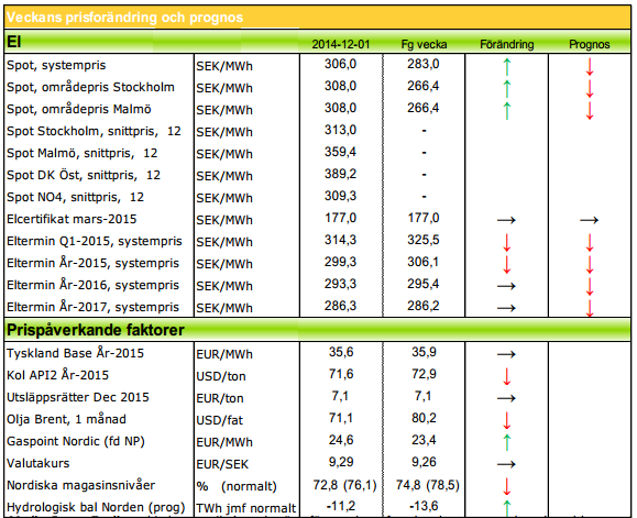 Nya prognoser är blöta och rätt milda. Elterminerna faller och vad gäller bränslet är det ännu mer nedåt. Oljan är diskussionsämnet över hela världen – den går ner ohejdat. I övrigt verkar faran för kall och torr vinter bli mindre för varje dag.