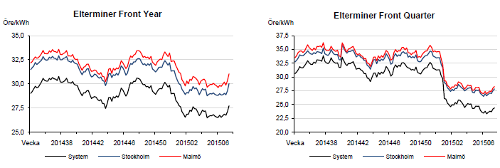 Förra veckan byttes de överblöta prognoserna ut mot mer måttliga och det fick veckan att visa en uppåtrörelse i både Q2-15 och YR-16. Den senare rätt så kraftigt. Skillnaden terminerna emellan var att Q2:an kom tillbaka lite på fredagen. Det gjorde inte året. Idag har nya prognoser i det närmaste fått Q2 att peka nedåt. Däremot ångar YR-16 på åt andra hållet. Det längre påverkas av andra faktorer än vädret i större grad än det korta. Vi ser högre priser i kol och CO2, vilket ger en starkare långtermin. Q2:an är mycket känsligare för vädret som är just nu och därför drar den nedåt. Omsätts i skrivande stund på 25,10. År 16 handlas nu på 28,90 €/MWh.