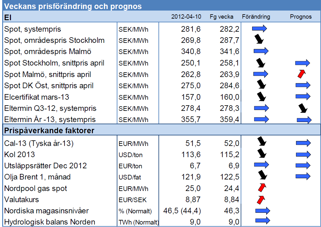 Temperaturer runt normalt har hållit spotpriserna över €28/MWh trots påsk ledighet. De senaste väderprognoserna visar på liknande temperaturer men mycket blötare. De närmaste dagarna kommer dock att präglas av låg vindkraftproduktion så spotpriser runt €31/MWh är att vänta. Dessutom bör vi få se ökade prisområdesskillnader då vinden avtar och spotpriserna i Tyskland väntas vara höga. De motverkas dock till viss del av mycket kärnkraft och då systempriset hålls upp av ett högt elpris i Finland. De blöta prognoserna bör påverka terminspriset för kvartal 3 och om de håller i sig kan det finnas ytterligare nedsida då vattenmagasinen fylls på ytterligare. De längre kontrakten påverkades av ett svagt bränslekomplex. Här ser vi en fortsatt relativt svag marknad men bl.a. fortsatt ökade sanktioner mot Iransk olja gör att nedsidan begränsas och vi tror på en sidledes riktning. Utsläppsrätterna har återhämtat sig från priser under €6/t som berodde på statistik från EU om att utsläppen under 2011 blev lägre än under 2010 och marknadens förväntningar.