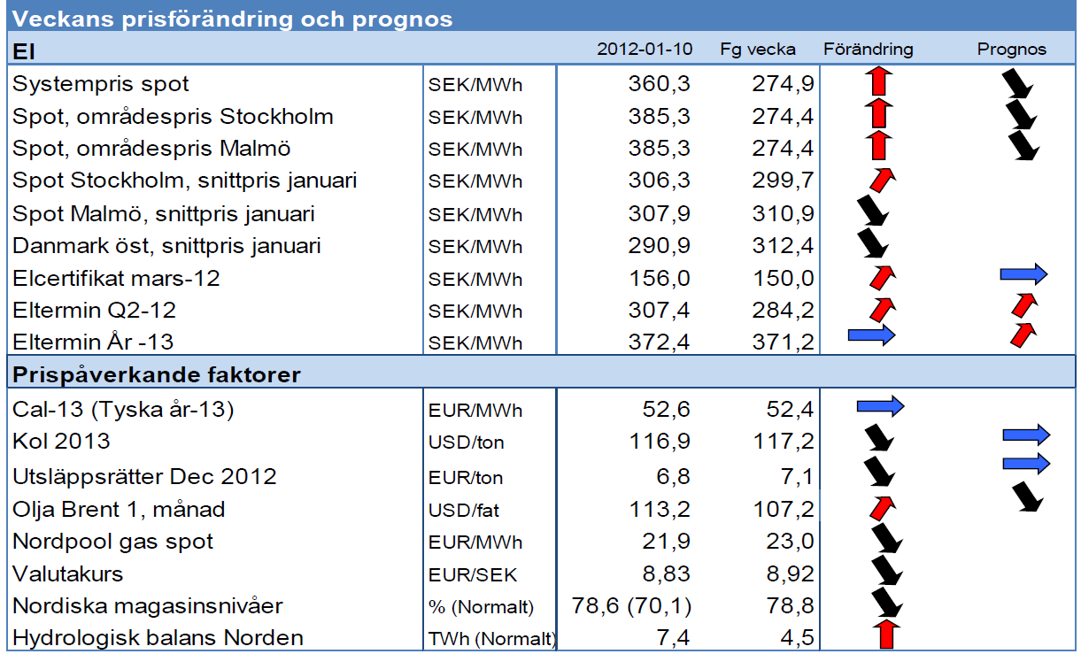 Dagens höga spotpris och avtagande temperaturer längre fram i prognoserna gör att terminspriserna för framförallt det närmaste kvartalet stiger idag. Priserna ligger dock fortfarande långt under brytpriset på kolkondens som är ca €40/MWh för 2012. De närmaste dagarna kommer det vara stort fokus på väderuppdateringar och om de visar på att vintern trots allt kan komma framåt slutet av januari finns det en uppsida på kontrakten. Oljan bör fortsätta i sidled men risken finns för ytterligare politiska oroligheter i Iran vilket skulle påverka även elpriset uppåt. Även den tekniska analysen visar att trenden nu verkar vända och att riskerna främst ligger på uppsidan.