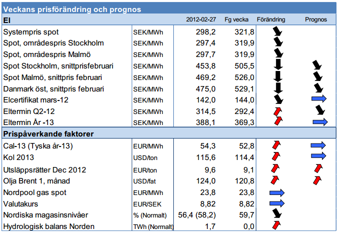 Den närmaste veckan väntas dock bli varmare än normalt igen och det ska blåsa relativt mycket. I slutet av veckan blir det troligen åter lite kallare och det förväntas hålla i sig någon vecka åtminstone. Då det, från mitten av veckan, väntas bli torrt väder minskar det pressen på vattenkraftsproducenterna. Vi förväntar oss inga stora prisskillnader mellan elområdena. Terminskontrakten har främst påverkats av en stark marknad i Tyskland med höga bränsle- och CO2 priser. Nu väntar man på en politisk omröstning om ett eventuellt tillbakadragande av utsläppsrätter från perioden 2013-20. Bränslemarknaden ser fortsatt stark ut och därmed även de tyska elpriserna som i sin tur påverkar de längre kontrakten på Nordpool. Det hydrologiska läget har dock stärkts ytterligare och vi har en mycket bra energibalans, framförallt om kärnkraften nu kommer tillbaka som planerat. Det bör därför finnas en stor nedsida för det närmaste kvartalet som ändå går i leverans under vårmånaderna och vårfloden.
