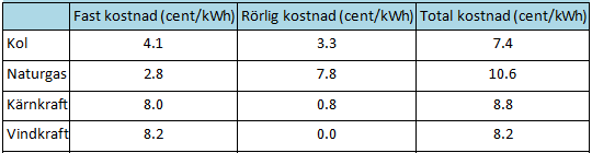 Kostnad olika energikällor 2008