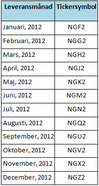 *2 avser årtalet, vilket betyder att tickern NGM2 avser leverans av naturgas i juni 2012.