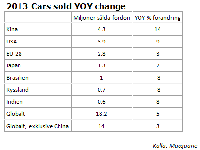 Nedanstående diagram visar förändringen av antalet miljoner sålda fordon i en rad olika länder. Notabelt är att det är i Brasilien och Ryssland som vi ser en nedgång i bilförsäljningen, i alla andra länder ser vi att försäljningen ökar, till och med inom EU, vilket kan betyda att den ekonomiska kris som plågat Europa de senaste åren ser ut att gå mot sitt slut.