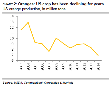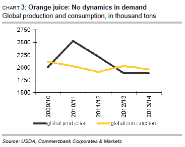 Unlike global orange production itself, where growth not only in Brazil but also in China will probably more than offset the decline in the US, global orange juice production should stagnate in 2013/14 in the best case according to the USDA. Juice production had already declined in the two preceding years.